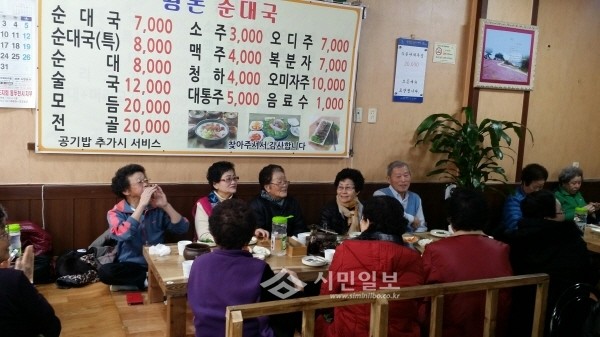 최근 경기 동두천시 중앙동에 소재한 '황돈 순대국'은 경로당 노인 20명을 초청해 사랑의 중식 봉사활동을 실시했다. 사진은 행사에 참여한 노인들이 이야기를 나누는 모습.(사진제공=동두천시청)