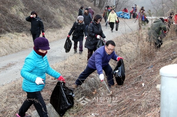 지난 4일 경기 의정부시 호원행정복지센터는 봄을 맞아 호원권역 취약지역에 대한 대청소에 나섰다. 사진은 행사에 참석한 홍귀선 의정부시 부시장(가운데)이 사패산 등산로에서 쓰레기를 줍는 모습.(사진제공=의정부시청)