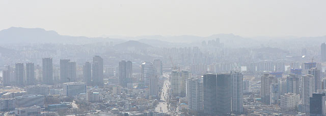 올해들어 첫 중국발 황사가 유입된 6일 오후 서울 중구 N서울타워에서 바라본 서울 도심이 흐린 모습을 보이고 있다. 기상청은 6일 새벽 서해5도 지역에 올해 첫 ‘황사주의보’를 발령했고, 서울은 오전 11시 올해 첫 메시먼지 주의보가 내려졌다 오후 1시에 해제됐다.