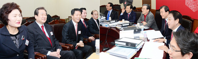 6일 오전 서울 여의도 새누리당사에서 실시된 공천면접에 참석한 김무성 대표와 참석자들이 공천관리위원들의 질문에 웃고 있다(왼쪽). 공천면접에서 이한구 공천관리위원장과 공천관리위원들이 김무성 대표와 이야기를 나누며 웃고 있다.