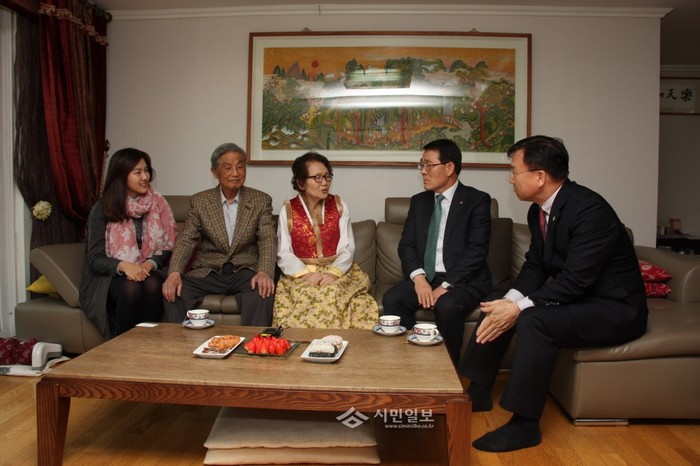 지난 3일 서울지방보훈청은 3.1절 계기 사회명사로 (주)한화 방산부문 이태종 대표이사를 위촉하고 독립유공자 특별 위문을 실시했다. 사진은 이경근 서울지방보훈청장(오른쪽)과 이 대표이사가 위문 방문을 진행하는 모습.(사진제공=서울지방보훈청)