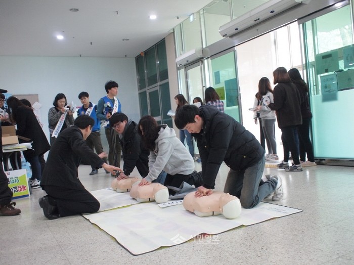 지난 4일 경기 안성시는 ‘제240차 안전점검의 날’을 맞아 한경대학교에서 자율방재단, 한경대학교 직원 등 50여명이 참석한 가운데 안전캠페인을 실시했다. 사진은 행사 관계자들이 심폐소생술을 시연하는 모습.(사진제공=안성시청)