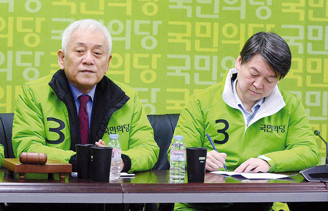 국민의당 안철수 공동대표와 김한길 선대위원장이 7일 서울 마포구 당사에서 열린 선거대책위원회의에서 회의 시작을 준비하고 있다.
