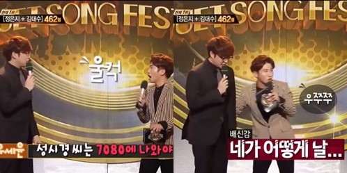 이에 가수들은 "MC를 보는 성시경씨가 가장 선배다"라고 대답했다. 이를 들은 유세윤은 "성시경씨는 7080에 나오셔야 되는..."이라고 말을 했고 성시경은 손에 든 대본을 유세윤에서 던져 웃음을 자아냈다.