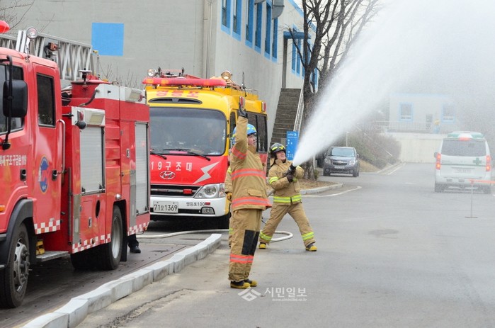 영등포소방서는 지난 7일 양화동에 위치한 영등포 정수장에서 '민·관 합동 실전대응을 위한 소방훈련'을 실시했다. 사진은 훈련에 참석한 관계자들이 소화설비를 이용한 화재진압훈련을 하는 모습.(사진제공=영등포소방서)