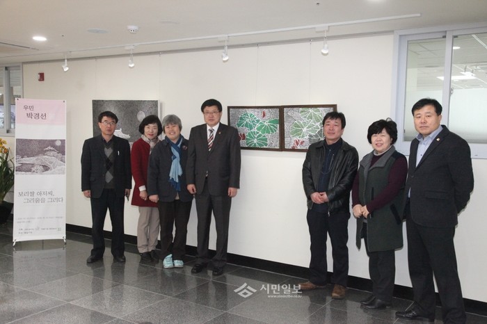 경기 수원시 팔달구에서는 '2016 수원화성 방문의 해' 를 맞아 지난 3일부터 청사 문화갤러리를 운영하고 있다. 사진은 8일 배민한 팔달구청장(가운데)이 청사에 작품을 전시한 박경선 작가(오른쪽에서 세 번째)와 기념촬영을 하는 모습.(사진제공=팔달구청)