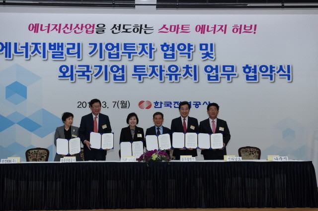 이날 협약에는 조환익 한전사장, 윤장현 광주시장, 이낙연 전남도지사, 강인규 나주시장, 임수경 한전KDN 사장과 28개 기업 대표들이 참여했다.