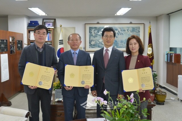 | ▲ 유태철 의장(오른쪽에서 두 번째)과 회계연도 결산검사위원으로 선임된 김주은 의원, 곽희홍, 김대현 세무사가 기념촬영을 하고 있다. | ||