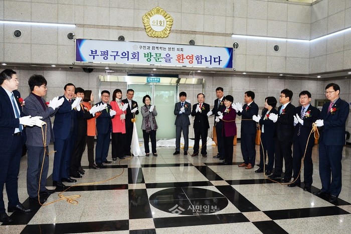 인천 부평구의회가 지난 7일 의회 상징마크의 한문표기를 한글인 '의회'로 바꾸고 의회로비에서 동판제막식을 개최한 가운데 홍미영 부평구청장(가운데 왼쪽)과 박종혁 의장(가운데 오른쪽)이 구의원들과 박수를 치며 축하하고 있다.(사진제공=부평구의회)