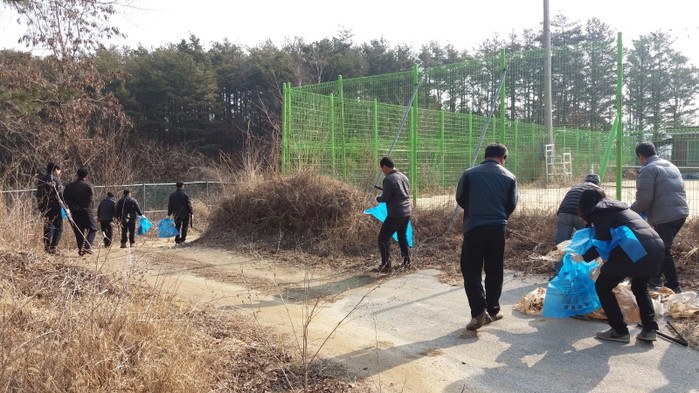 최근 경기 포천시 관인면은 3월 회의 시작 전 지역내 단체와 공무원들이 함께 지역내 테니스장 일대를 대청소해 3t의 쓰레기를 수거했다. 사진은 관계자들이 쓰레기를 수거하는 모습.(사진제공=포천시청)