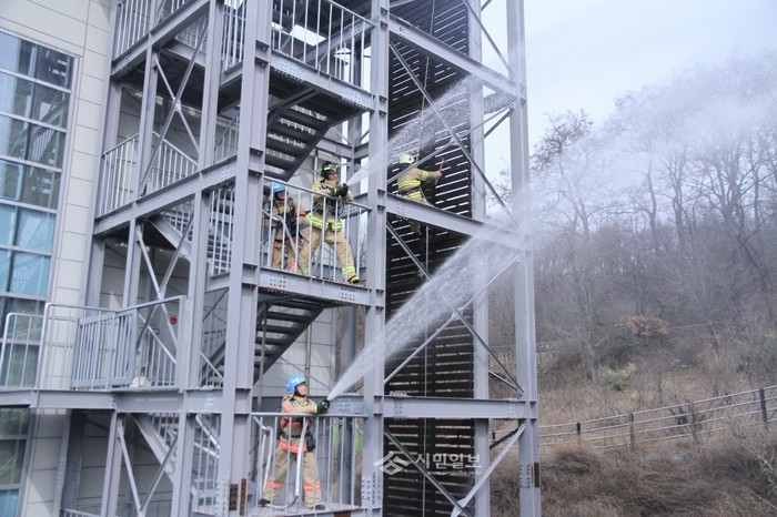 지난 8일 은평소방서는 소방서내 다목적 훈련탑에서 '현장대응능력 향상을 위한 인명구조 및 화재진압훈련'을 실시했다. 사진은 소방관들이 화재진압 방수훈련을 진행하고 있는 모습.(사진제공=은평소방서)