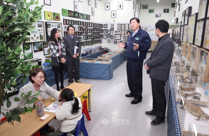 조길형 서울 영등포구청장(오른쪽에서 두 번째)이 지난 7일 찾아가는 현장행정의 일환으로 교육복지복합타운내에 조성된 '곤충체험학습장'을 찾아 관계자들과 내부를 둘러보고 있다.(사진제공=영등포구청)