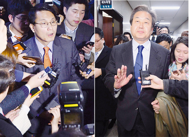 ‘김무성 욕설 녹취록’ 파문으로 구설에 오른 새누리당 윤상현 의원이 9일 서울 여의도 국회를 나서며 취재진의 질문에 답변하고 있다. 윤 의원은 이날 김무성 대표에게 면담 요청을 했지만 거부당했다(왼쪽). 새누리당 김무성 대표가 9일 서울 여의도 국회에서 취재진에 둘러싸인 채 이동하고 있다. 김 대표는 막말 파문으로 구설에 오른 윤상현 의원의 면담 요청을 거부했다.