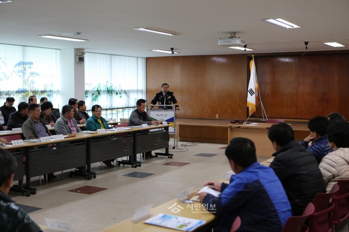 지난 8일 경기 용인동부경찰서는 처인구 백암면 면사무소 2층 회의실에서 각 마을 이장 및 주민 등 70명이 참석해 지역사회 네트워크 활성화를 위한 ‘우리동네 치안간담회’를 개최했다. 사진은 이왕민 경찰서장이 간담회를 주재하고 있는 모습.(사진제공=용인동부경찰서)