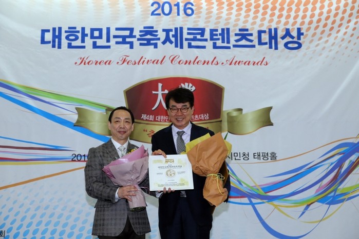 지난 9일 서울시청 태평홀에서 열린 제4회 대한민국축제콘텐츠대상 시상식에서 '정남진장흥물축제'가 4년 연속 관광축제 부문 대상을 수상했다. 사진은 김성 장흥군수(오른쪽)와 차정현 한국축제콘텐츠협회장이 기념촬영을 하는 모습.(사진제공=장흥군청)