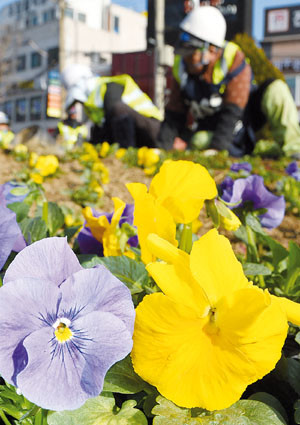 비교적 완연한 봄 날씨를 보인 10일 오후 경기도 수원시 화서공원로터리 인근 화단에서 팔달구청 관계자들이 봄소식을 알리는 팬지꽃을 식재하고 있다.