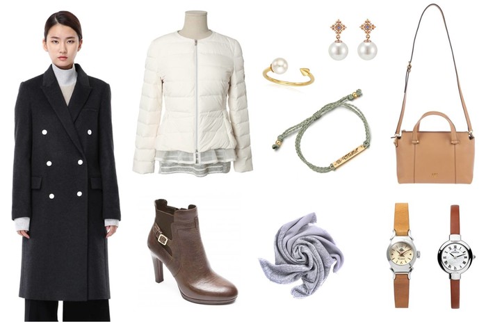 주얼리는 실버보다는 옐로우 골드, 로즈 골드 계열로 택하는 것이 무난하다. 진주 디테일이 있는 아이템을 택하는 것이 보다 포근한 이미지를 심어준다. 여기에 은은한 컬러감의 스카프를 둘러준다면 추위에도 끄떡없는 스타일리쉬한 룩을 완성할 수 있다.