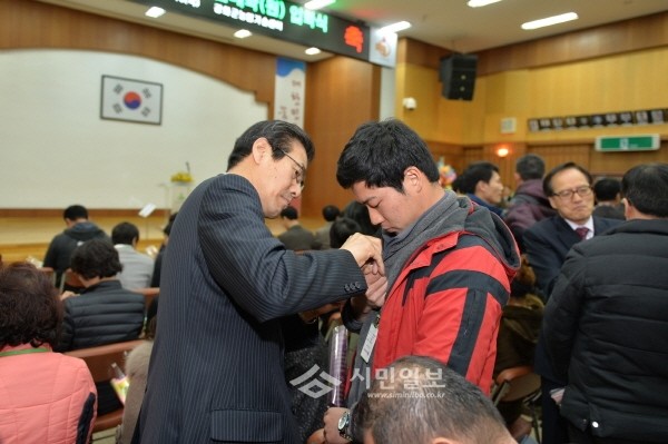 최근 인천시 강화군은 강화군농업기술센터 풍년홀에서 이상복 강화군수를 비롯해 안상수 국회의원, 유호룡 강화군의회 의장, 입학생 등 200여명이 참석한 가운데 2016년 강화군농업대학 및 대학원 입학식을 개최했다. 사진은 이상복 군수(왼쪽)가 신입생에게 배지를 달아주고 있는 모습.(사진제공=강화군청)