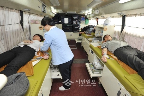 지난 10일 경기 광주시는 시청 주차장에서 간부공무원을 비롯해 직원, 사회복무요원, 일반 시민 등 80여명이 참여해 '사랑나눔 헌혈 행사'를 실시했다. 사진은 행사 참가자들이 헌혈을 실시하고 있는 모습.(사진제공=광주시청)