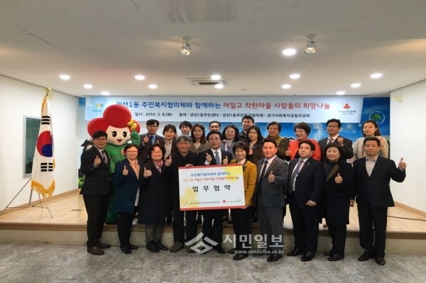 최근 경기 수원시 권선구 권선1동은 주민복지협의체, 경기사회복지공동모금회와 '어질고 착한마을 사람들의 희망나눔' 업무 협약식과 '십시일반 1004 기부릴레이' 행사를 개최했다. 사진은 행사에 참가한 관계자들이 기념촬영을 하는 모습.(사진제공=권선구청)