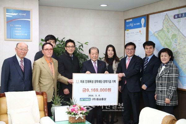 최근 (주)동승통상은 서울 마포구에 마포인재육성장학재단의 장학기금으로 916만9000원을 기탁했다. 사진은 박홍섭 구청장(가운데), 권오범 마포인재육성장학재단 이사장(왼쪽에서 두 번째), (주)동승통상 김철웅 대표(오른쪽에서 세 번째)등이 기념촬영을 하는 모습.(사진제공=마포구청)