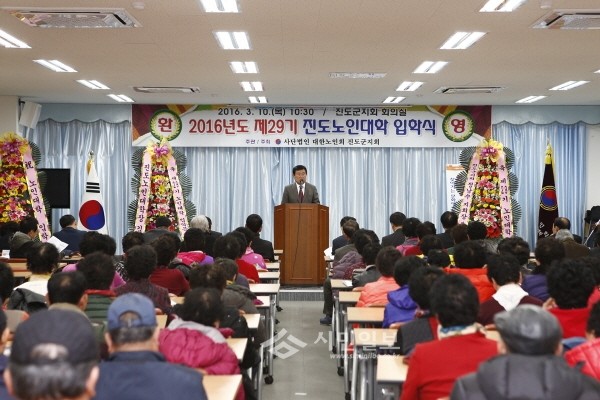 최근 전남 진도군은 이동진 진도군수를 비롯해 입학생과 가족들 200여명이 참석한 가운데 노인회관 2층에서 제29기 진도노인대학 입학식을 개최했다. 사진은 이 군수가 입학 축하 인사를 전하고 있는 모습.(사진제공=진도군청)
