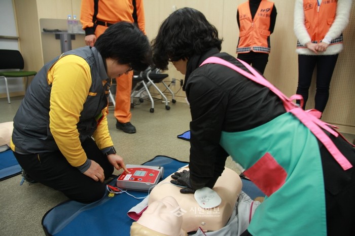 지난 11일 구로소방서는 이마트 구로점 6층 교육장에서 이마트 직원 90여명을 대상으로 '응급처치 실습교육 과정'을 운영했다. 사진은 교육에 참석한 관계자가 심폐소생술 실습을 하는 모습.(사진제공=구로소방서)