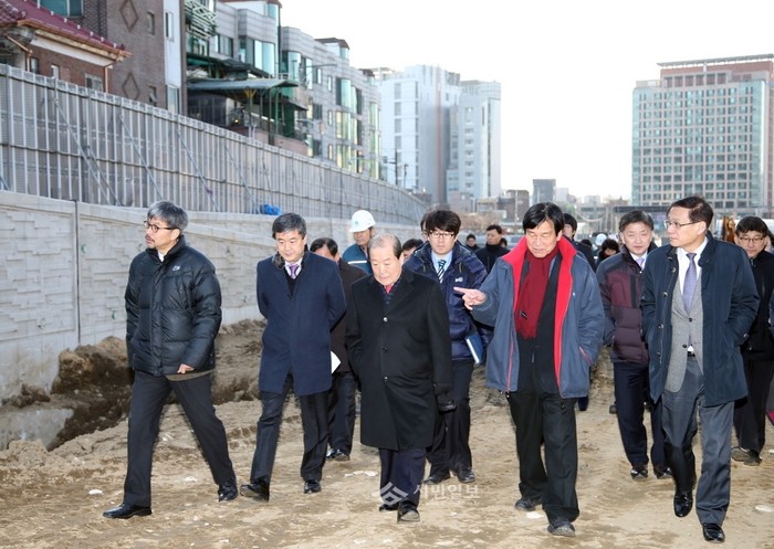 최근 박홍섭 마포구청장(앞줄 가운데)이 '경의선 책거리 조성 공사'가 진행 중인 경의선 홍대역사 사업부지를 방문해 공사 관계자 및 관련 부서 직원들과 함께 현장을 점검하고 있다. 경의선 책거리는 오는 8월 공사가 완료될 예정이다.(사진제공=마포구청)