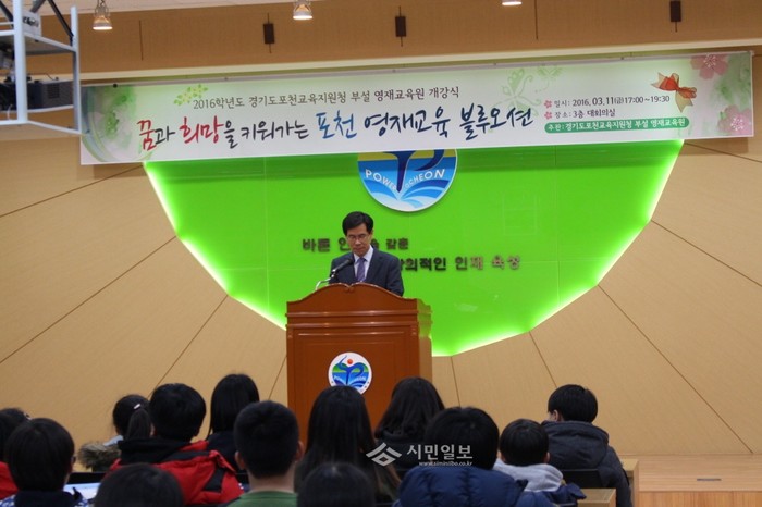 지난 11일 경기도포천교육지원청은 초등학생 46명(4, 5, 6학년 3개반), 중학생 12명(1학년 1개반)의 학생과 학부모, 지도교사 등 150여명이 모인 가운데 영재교육원 개강식을 진행했다. 사진은 포천교육지원청 관계자가 인사말을 하는 모습.(사진제공=포천교육지원청)