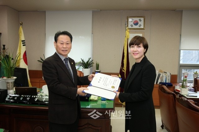 | ▲ 박경준 의장이 2015회계연도 결산검사 김해선 대표위원에게 위촉장을 전달하고 있다.(사진제공=성동구의회) | ||