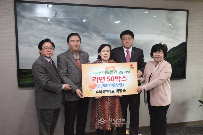 지난 14일 경기 수원시 팔달구 인계동 사랑나눔가게 8호점 ‘유치회관’은 새희망을 기원하는 이웃돕기로 저소득 위기가정 50여가구에 라면을 전달했다. 사진은 관계자들이 기념촬영을 하는 모습.(사진제공=팔달구청)