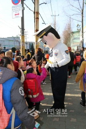 16일 인천중부경찰서는 동구 서흥초등학교에서 ‘안전한 통학로 만들기’ 캠페인을 전개했다. 사진은 경찰 마스코트인 포돌이가 학생들과 인사하는 모습.(사진제공=인천중부경찰서)