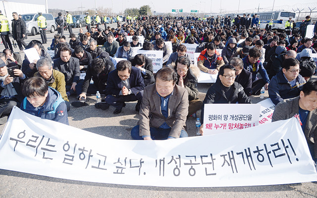 개성공단 입주기업 근로자들이 16일 오후 경기도 파주 통일대교 앞에서 개성공단 입주기업들이 처한 현실을 알리고, 조속한 보상책 마련 등을 촉구하는 대규모 집회를 갖고 있다.