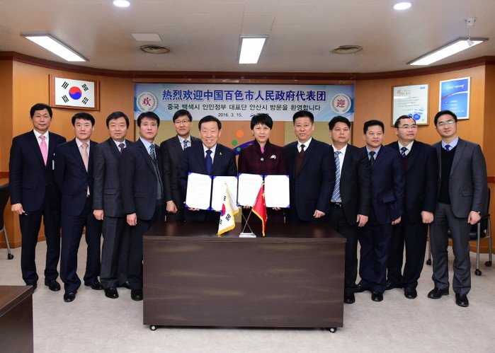 지난 15일 경기 안산시는 중국 백색시의 자오구이란 부시장 등 대표단과 농업 및 산업, 관광, 교육 등의 분야에서 교류 활성화를 위한 합의를 체결했다. 사진은 제종길 안산시장(왼쪽에서 여섯번째)과 자오구이란 부시장이 체결서를 들고 관계자들과 기념촬영을 하는 모습.(사진제공=안산시청)