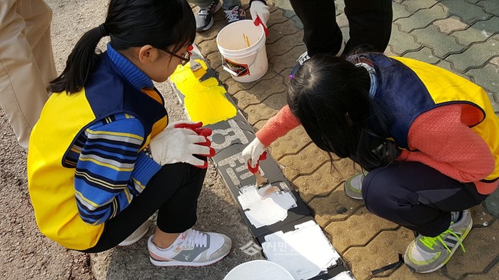 최근 도봉구 창1동 주민센터는 어린이 등하굣길 안전 캠페인 '양옆을 살펴요' 캠페인을 실시해 창일초등학교 인근 횡단보도 두 곳에 경계 문구 및 안내 그림을 그렸다. 사진은 어린이들이 페인트 작업을 진행하고 있는 모습.(사진제공=도봉구청)