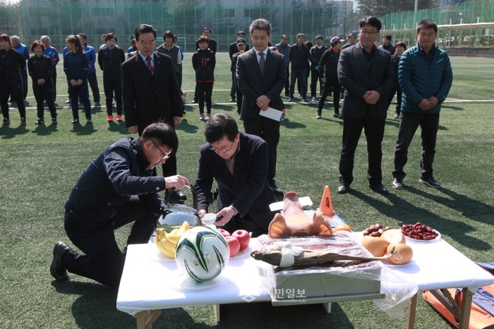 경기 수원시 권선구 여성축구단은 지난 15일 수원산업단지내 솔대축구장에서 창단 15주년을 기념하는 단배식을 열었다. 사진은 박흥수 구청장(가운데)과 관계자들이 선수단의 무사고와 건승을 기원하는 제례를 지내는 모습.(사진제공=권선구청)