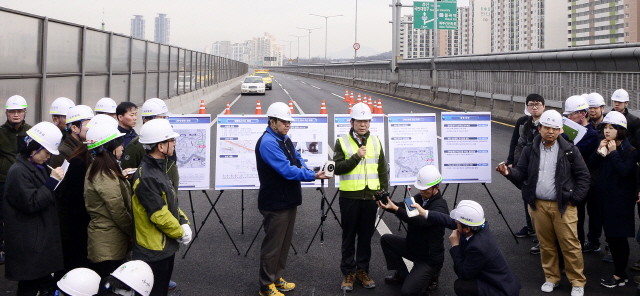박원순 서울시장이 17일 오전 서울 성동구 시설관리공단 인근 내부순환로 정릉천 고가 상부에서 통행 재개에 따른 안전점검을 한 후 취재진의 질문에 답변을 하고 있다.