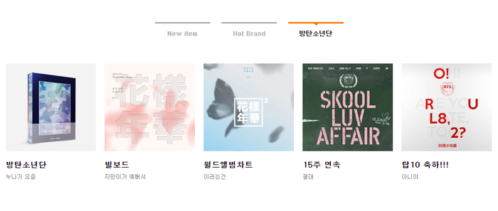 실제로 핫트랙스 홈페이지(사진)를 보면 '뉴아이템' '핫브랜드' 메뉴 옆에 '방탄소년단' 메뉴를 삽입했다.