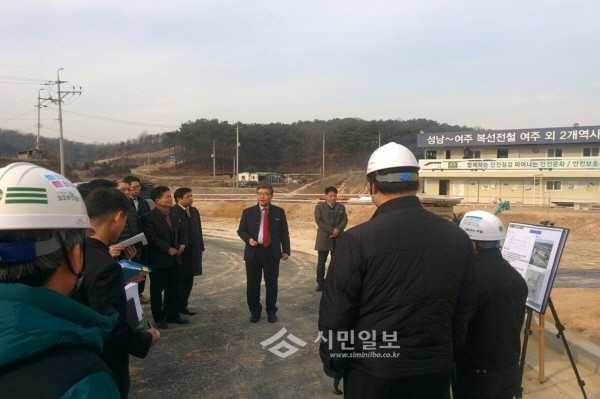 최근 경기 여주시는 부시장, 담당과장, 8급 이하 신규공무원 등으로 구성된 17명의 점검팀이 '성남~여주간 복선전철' 개통에 대비해 여주역·영릉역 현장점검을 실시했다. 사진은 원경희 여주시장(가운데)이 관계자들과 공사현장을 방문해 보고를 받는 모습.(사진제공=여주시청)