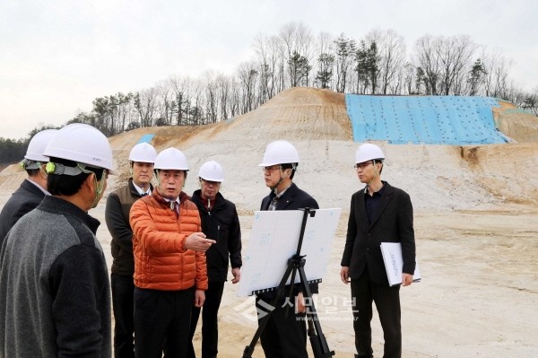 최근 정찬민 경기 용인시장은 제일바이오산단과 원삼산단 등 지역내 산업단지 공사현장 2곳을 방문, 해빙기 안전여부를 점검하고 산단 추진에 관한 기업 애로사항을 청취했다. 사진은 정 시장(가운데)이 공사현장 시찰을 진행하고 있는 모습.(사진제공=용인시청)