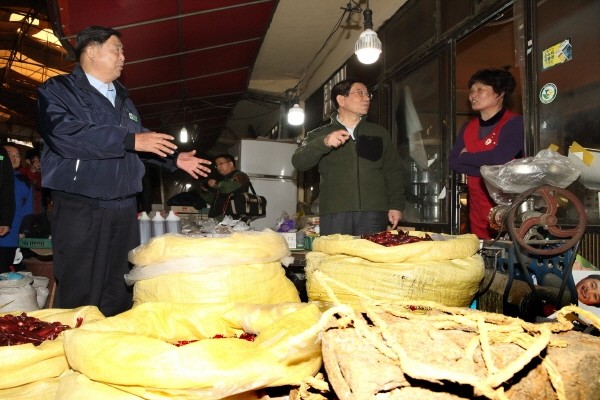 조길형 서울 영등포구청장(왼쪽)이 지난 16일 박원순 서울시장(가운데)과 함께 현장행정의 일환으로 지역내 전통시장인 양남시장을 찾아 시장상인과 이야기를 나누고 있다.(사진제공=영등포구청)