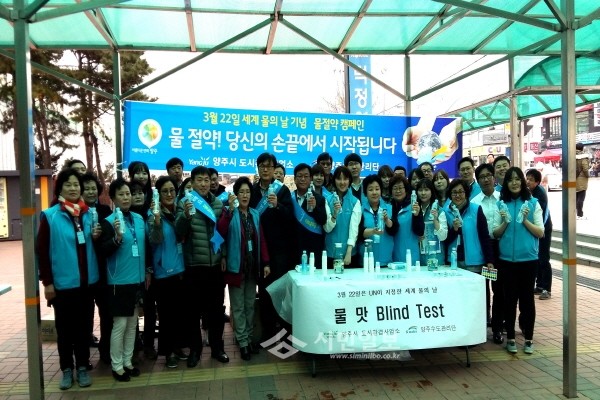 최근 경기 양주시는 세계 물의 날을 맞아 덕정역 인근에서 ‘2016년 물 절약 캠페인’을 실시했다. 사진은 행사에 참석한 관계자들이 기념촬영을 하는 모습.(사진제공=양주시청)