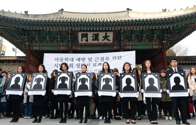 굿네이버스, 초록우산 어린이재단 등 42개 시민사회단체 회원들이 20일 오후 서울 중구 덕수궁 대한문 앞에서 아동학대 예방 및 근절을 촉구하는 퍼포먼스를 하고 있다.