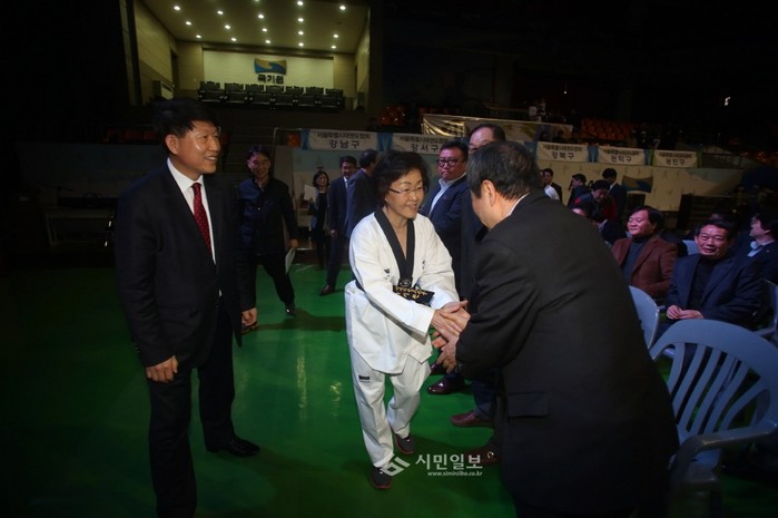지난 19일 강남구와 서울시 태권도협회는 국기원에서 태권도 상설공연 활성화를 위한 업무협약을 맺었다. 사진은 신연희 구청장(가운데)이 관계자들과 악수하는 모습.(사진제공=강남구청)