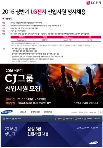 | ▲ 사진=lg채용-cj채용-삼성채용 홈페이지 캡쳐 | ||