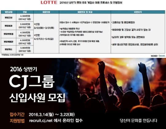 한편 롯데그룹 채용은 오는 31일 오후 6시까지 롯데그룹 채용 사이트를 통해 지원을 받으며 2016년 상반기 CJ그룹 신입사원 서류 접수는 오늘(22일) 18시 마감한다.