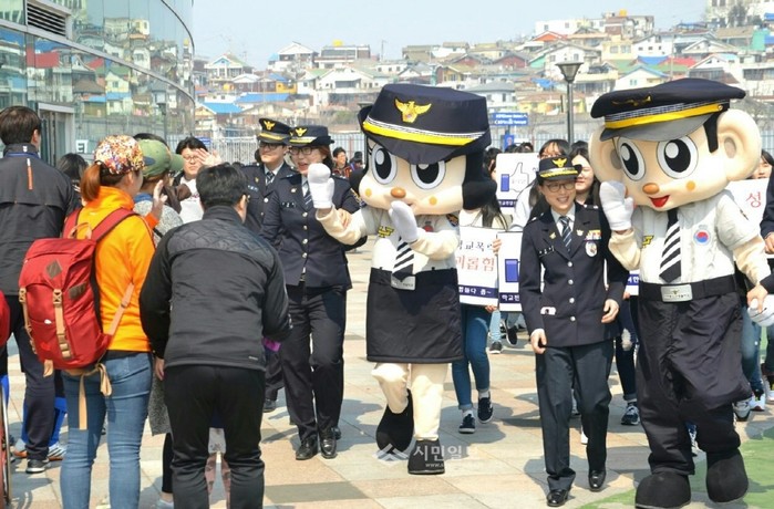 지난 20일 인천 중부경찰서는 인천 축구전용경기장에서 열린 인천유나이티드 홈 개막전에서 4대 사회악 근절 및 체감안전도 향상을 위한 ‘진심! 주행중(진심으로 주민이 행복한 중부경찰)’ 캠페인을 전개했다. 사진은 관계자들이 포돌이·포순이 경찰 마스코트와 캠페인을 실시하고 있는 모습.(사진제공=중부경찰서)