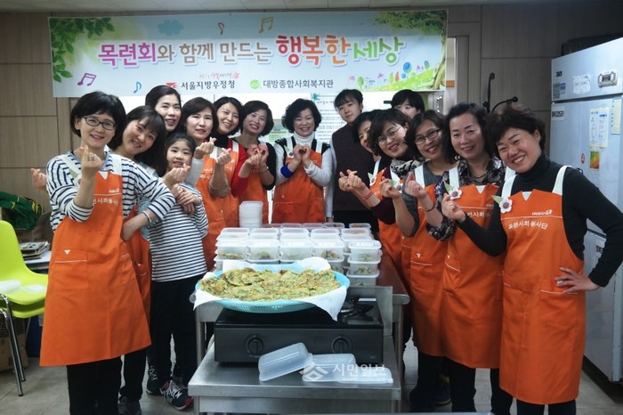 서울지방우정청 여직원들로 구성된 ‘목련회’ 회원들이 최근 서울 동작구 대방동 지역내 장애인 50가구에 사랑의 도시락을 배달했다. 사진은 직원들이 도시락을 직접 만들고 함께 기념촬영한 모습.(사진제공=서울지방우정청)