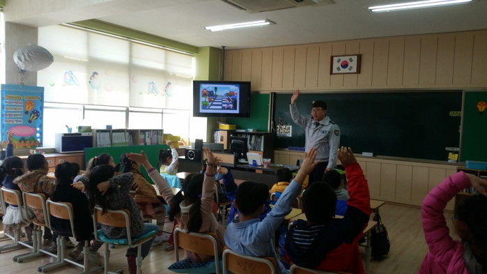 22일 충남 아산경찰서는 신학기를 맞아 영인초등학교 신입생 30명을 대상으로 교통안전교육을 전개했다. 사진은 경찰서 관계자가 학생들에게 교통규칙에 대해 설명하는 모습.(사진제공=아산경찰서)
