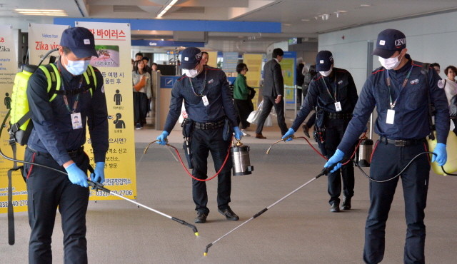 브라질에서 귀국한 L씨(43)가 지카바이러스 양성 판정을 받은 것으로 알려진 22일 오후 인천국제공항 입국장에서 인천국제공항공사 산하 방역 협력업체 직원들이 소독작업을 하고 있다.